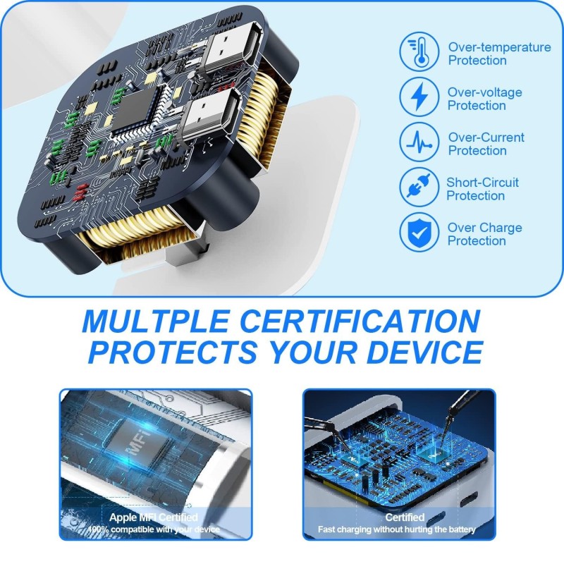 Apple MFi Certified 40W Dual USB-C PD iPad Fast Charger with 1*USB C to Lightning Cable and 1*USB C to C Cable for iPhone/iPad/AirPods/Macbook/Samsung.